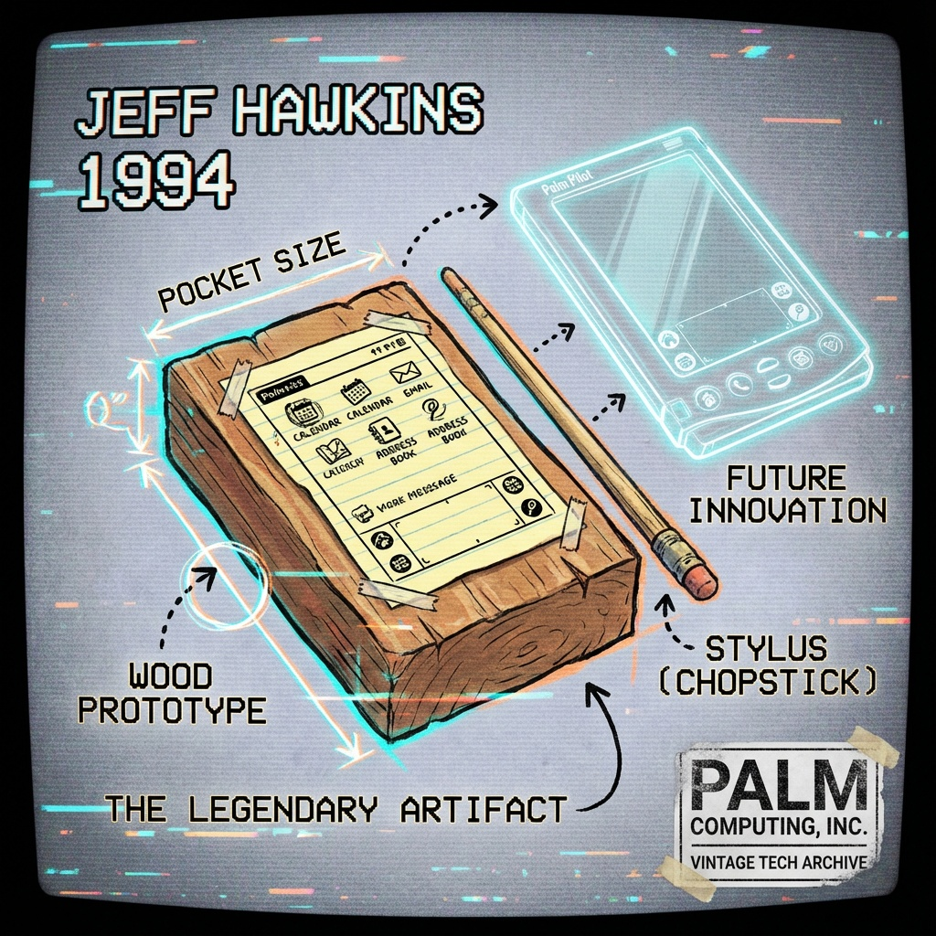 L'histoire du Palm Pilot commence par une légende tech tellement absurde qu'elle est véridique. En 1995, Jeff Hawkins - cofondateur de Palm Computing - se trimballe pendant des semaines avec un bloc de bois dans sa poche de chemise. Pas une maquette sophistiquée, non : un vrai morceau de bois sculpté, accompagné d'une baguette chinoise taillée en guise de stylet.